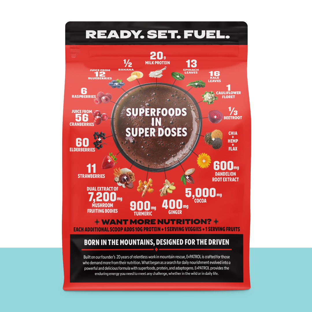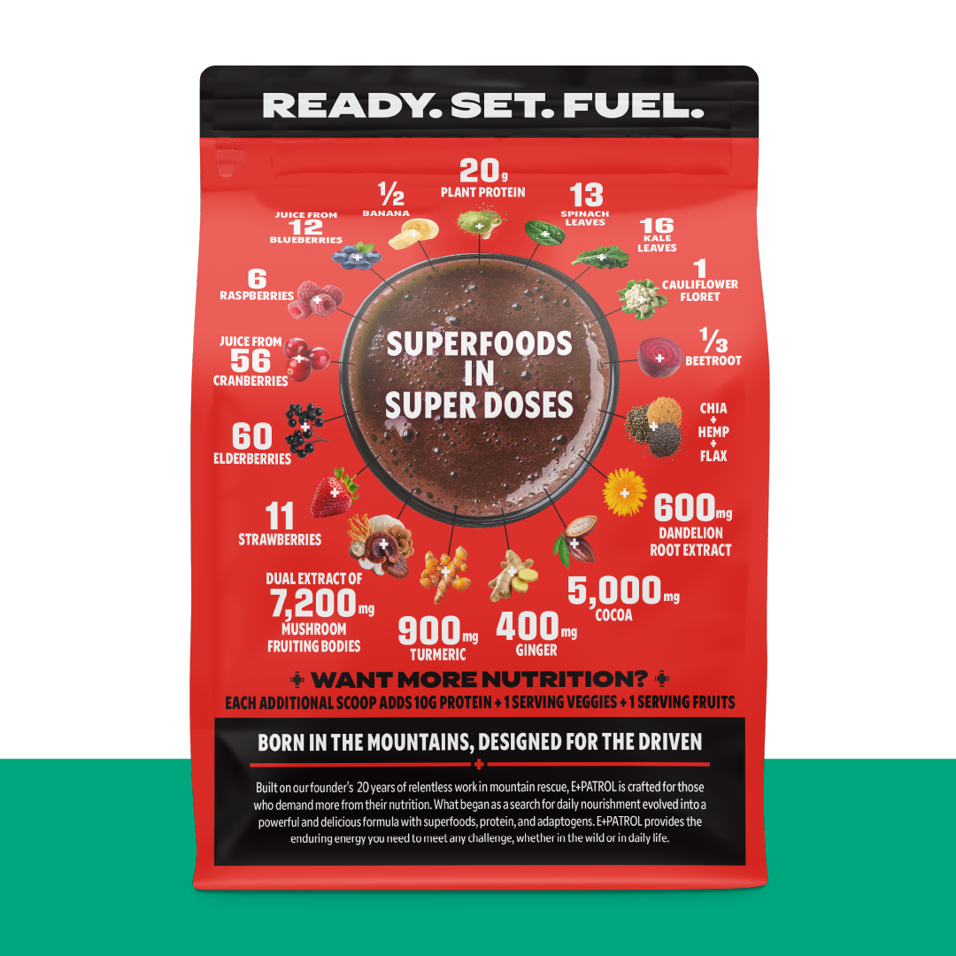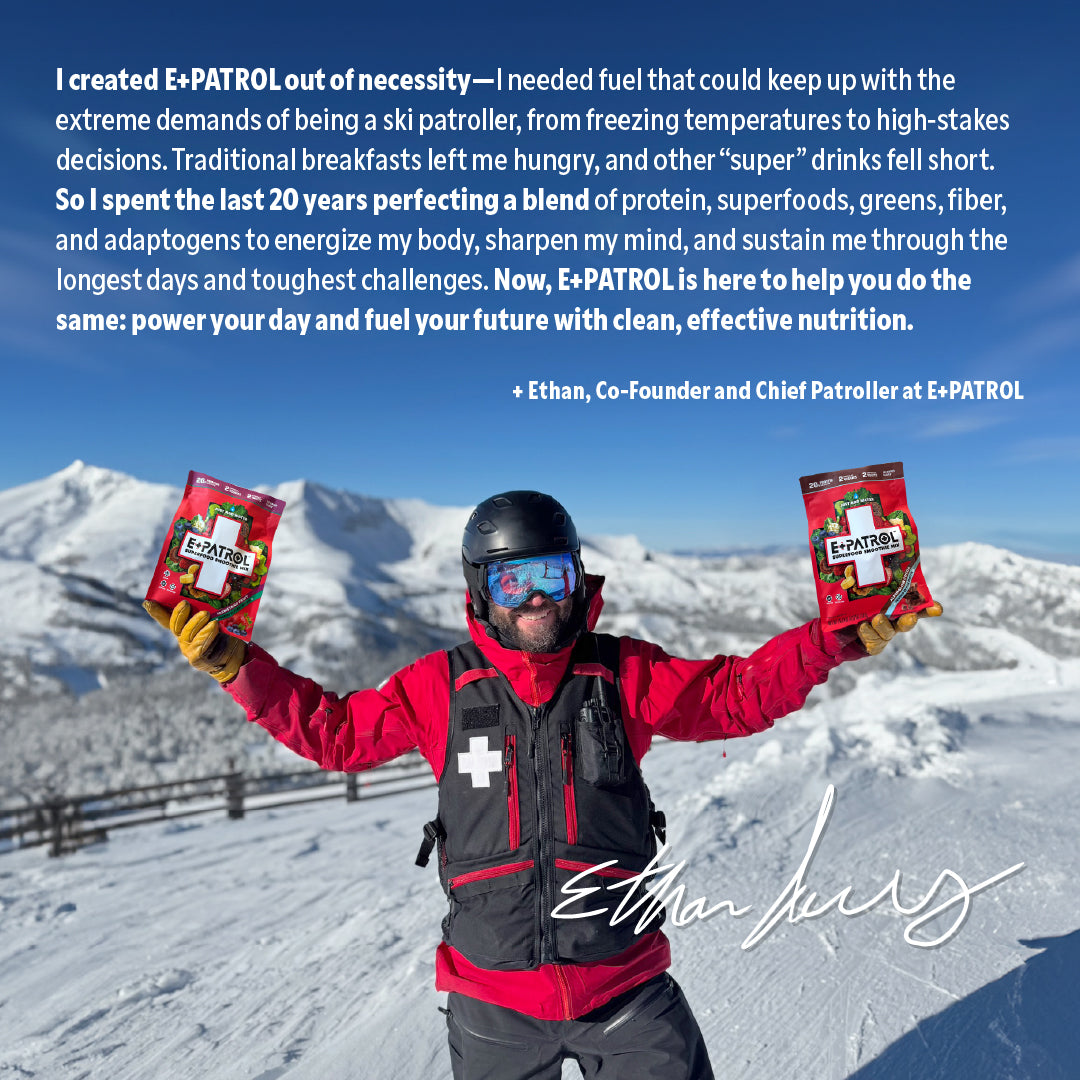 I created E+PATROL out of necessity—I needed fuel that could keep up with the extreme demands of being a ski patroller, from freezing temperatures to high-stakes decisions. Traditional breakfasts left me hungry, and other “super” drinks fell short. So I spent the last 20 years perfecting a blend of protein, superfoods, greens, fiber, and adaptogens to energize my body, sharpen my mind, and sustain me through the longest days and toughest challenges. Now E+PATROL is here to help you do the same: power your day and fuel your future with clean, effective nutrition.