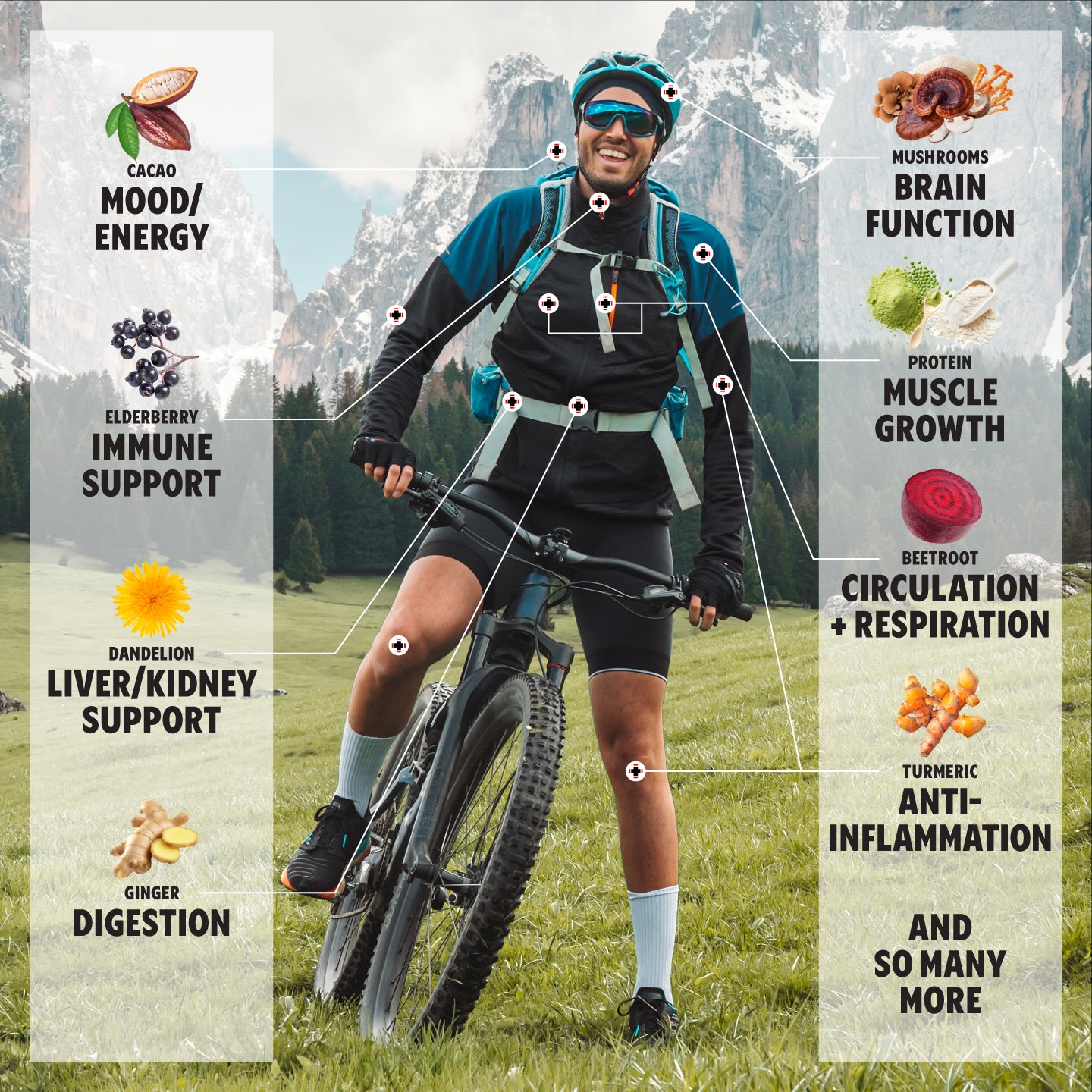 Simplify your protocol and get your protein powder, greens powder, fruit smoothie mix, functional mushrooms, beetroot powder, turmeric, elderberry, ginger, dandelion root and healthy fats all in a single delicious blend.